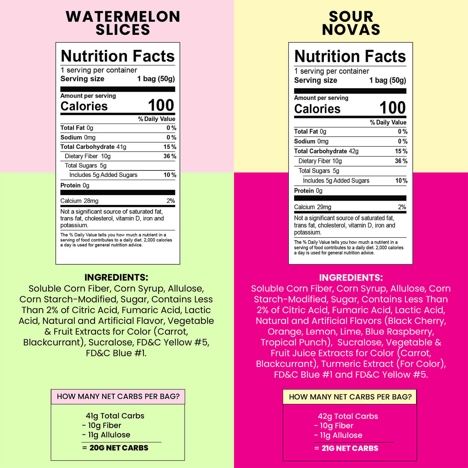 You know when you’re just craving Sour Patch Kids and nothing else will do. Our Sour Novas pack the flavor, chew, and sourness you’d expect from Sour Patch Kids but WITHOUT 36g of sugar. Each pack has around 29 pieces of candy with a variety of juicy flavors: Blue Raspberry, Black Cherry, Lime, Lemon, Orange, Tropical Punch. Enjoy candy with 90 calories per package and only 2-5 grams of sugar.
