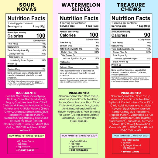 Each bag of our Sour Novas has only 100 calories and 5g of sugar. The best part, they taste exactly like traditional sour candies so you can satisfy your gummy craving without all the sugar.